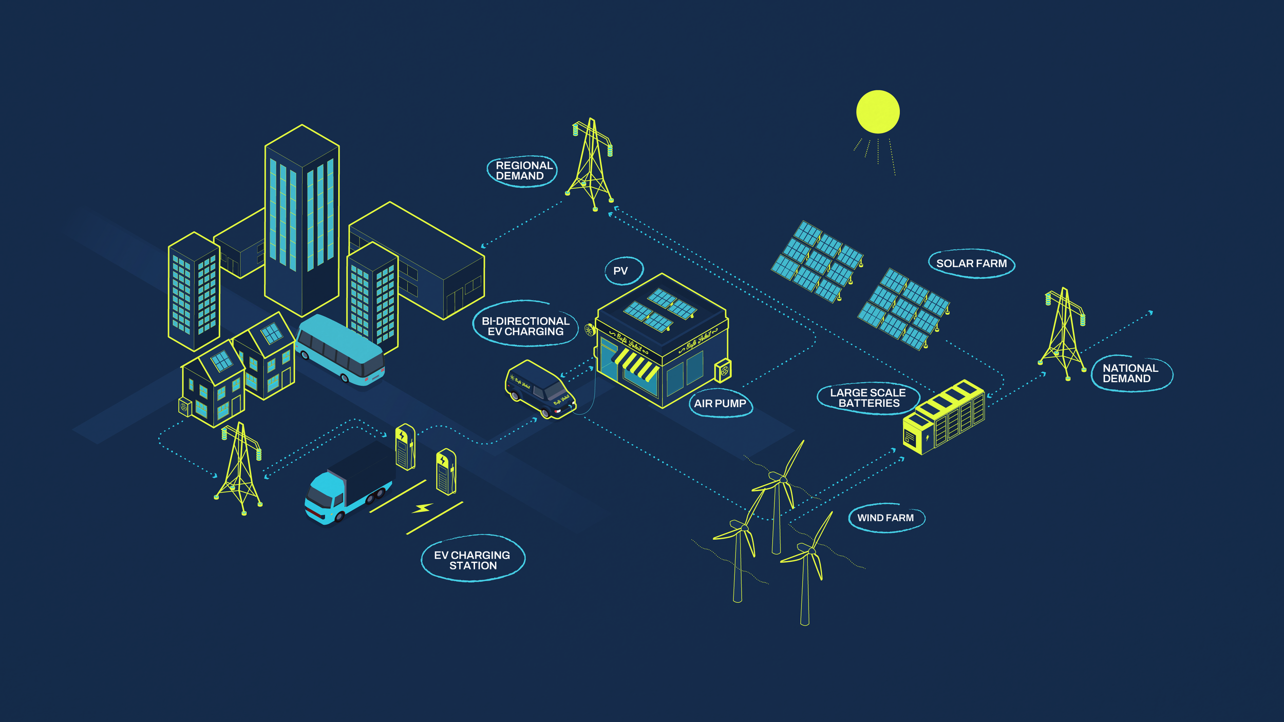 Virtual Power Plants allow energy consumers to generate their own renewable energy (on-site) and link it with their electric transport (on-road) as well as the electricity network (on-grid). Homes, shops, factories, car parks and public buildings can all become mini power stations, consuming on-site, feeding into mobile power stations (vehicles) and the grid, as well as storing energy. The overall effect? To massively reduce the need for grid capacity while still delivering for people and planet.